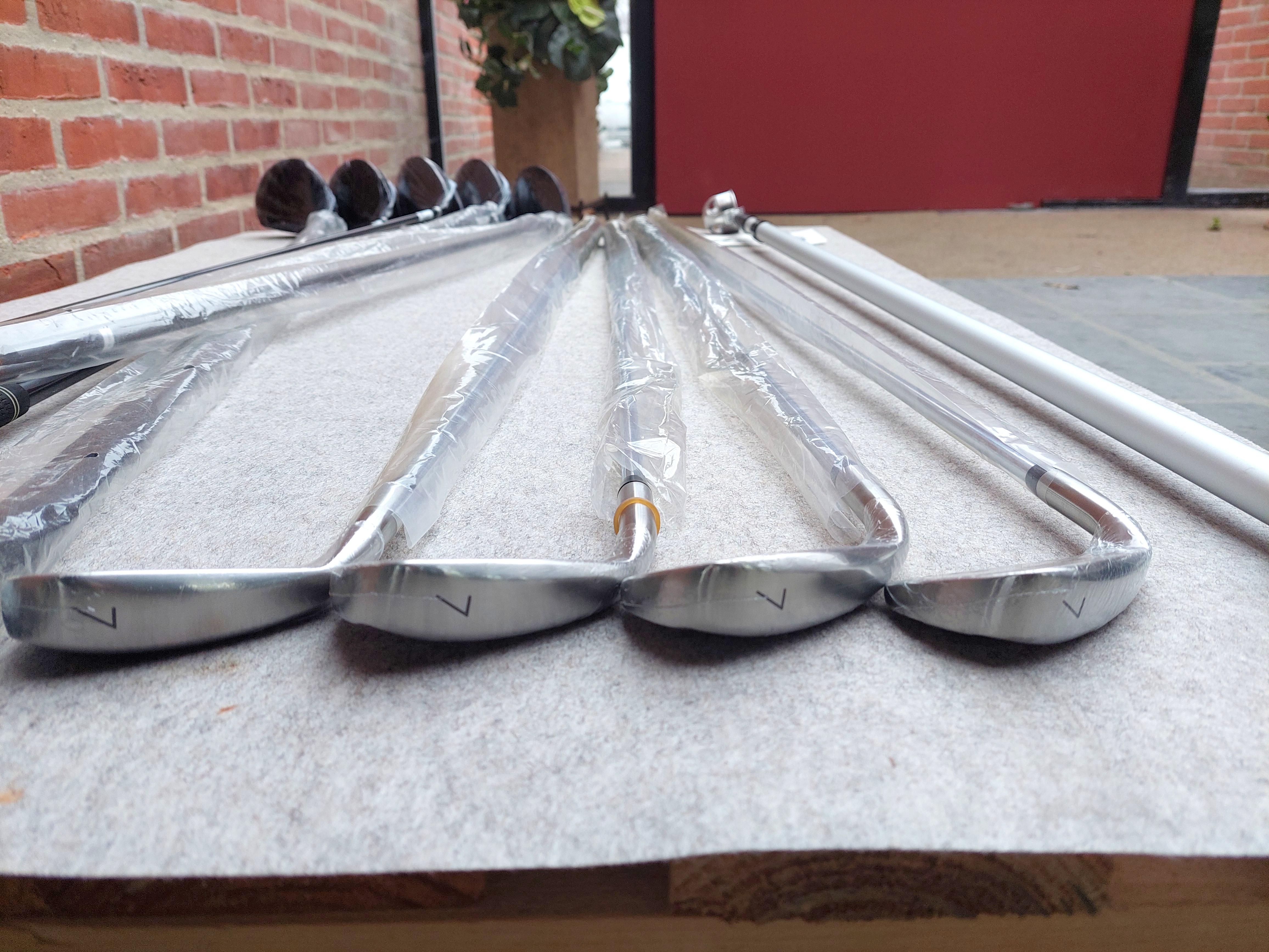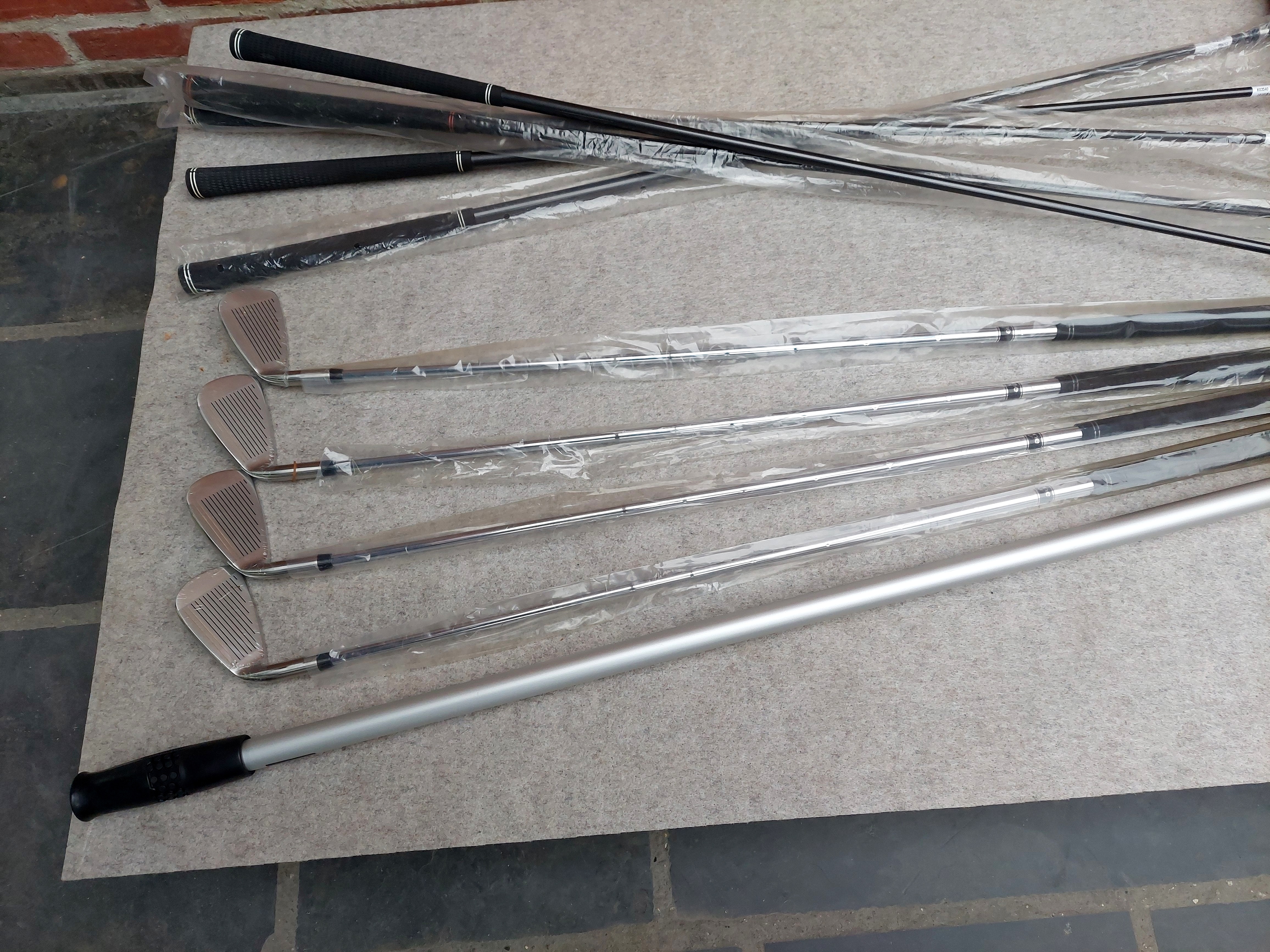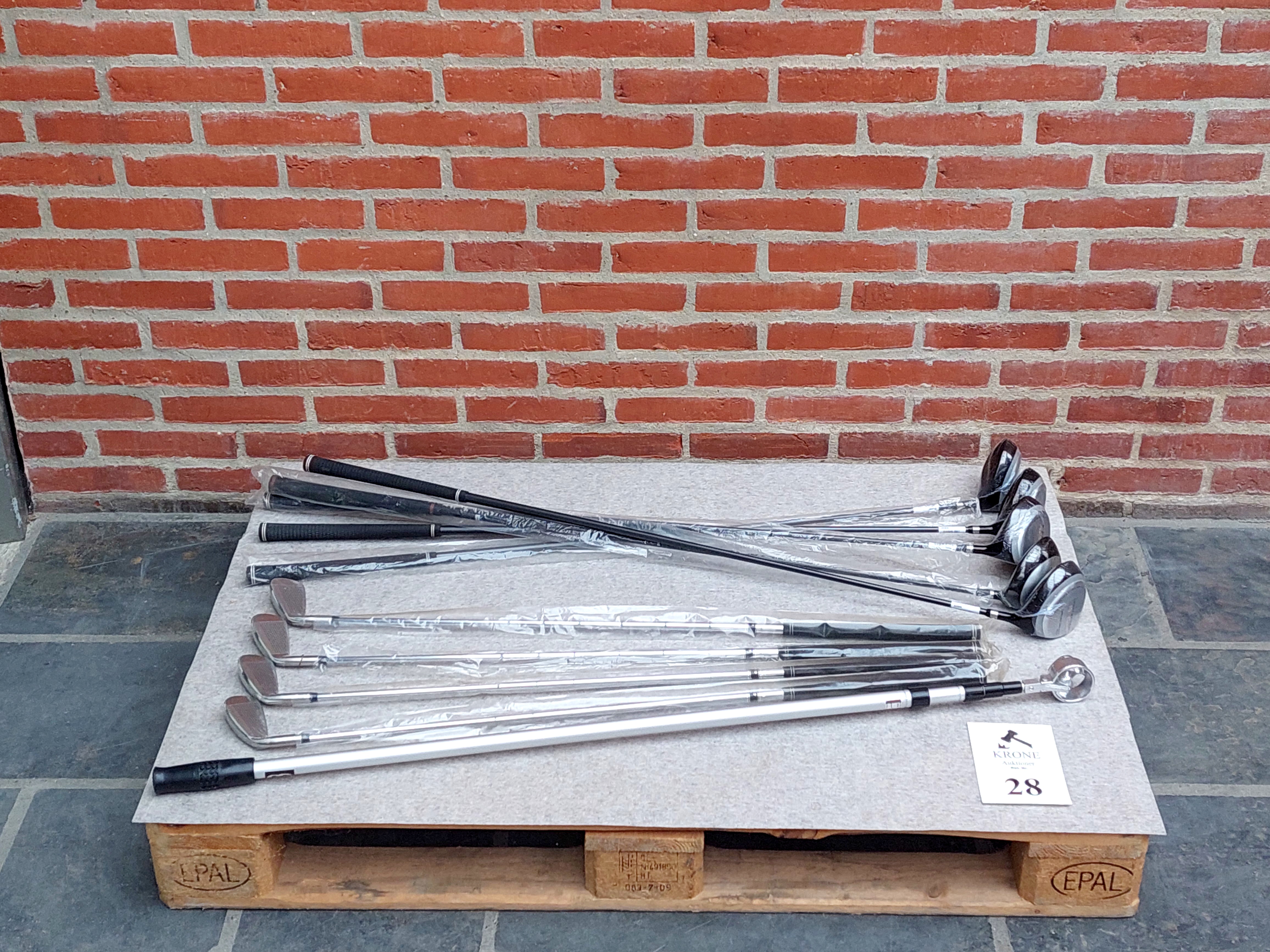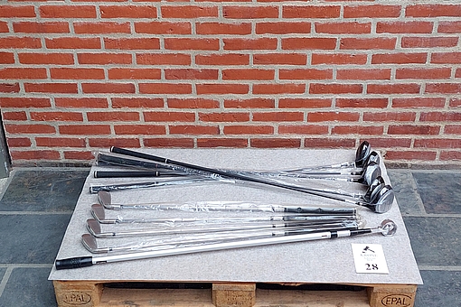 #28 10 stk Køller og jern. Heraf 5 køller og 4 jern (7, 7, 7, 7) samt en boldopsamler teleskop 3,75m ubrugte.