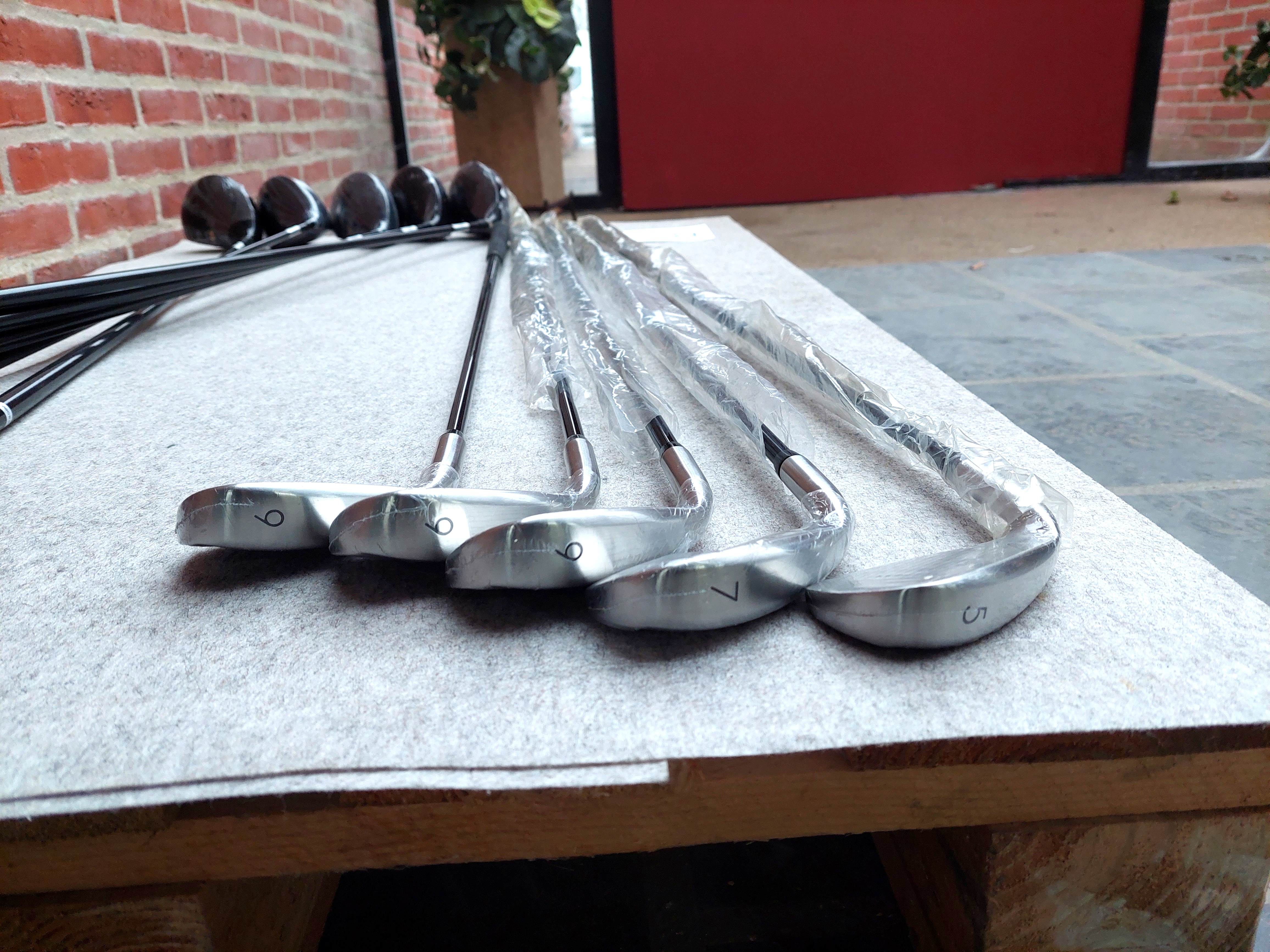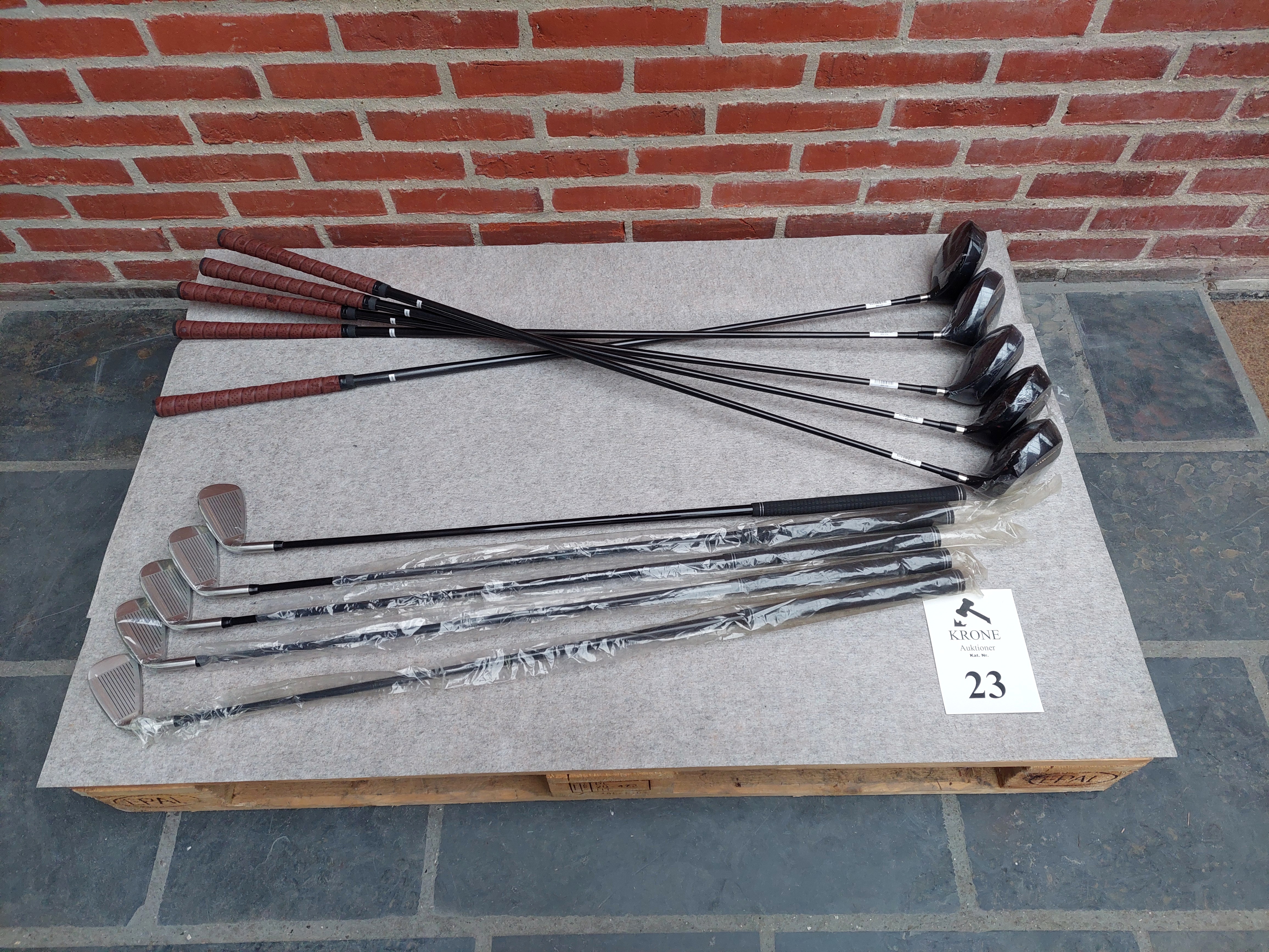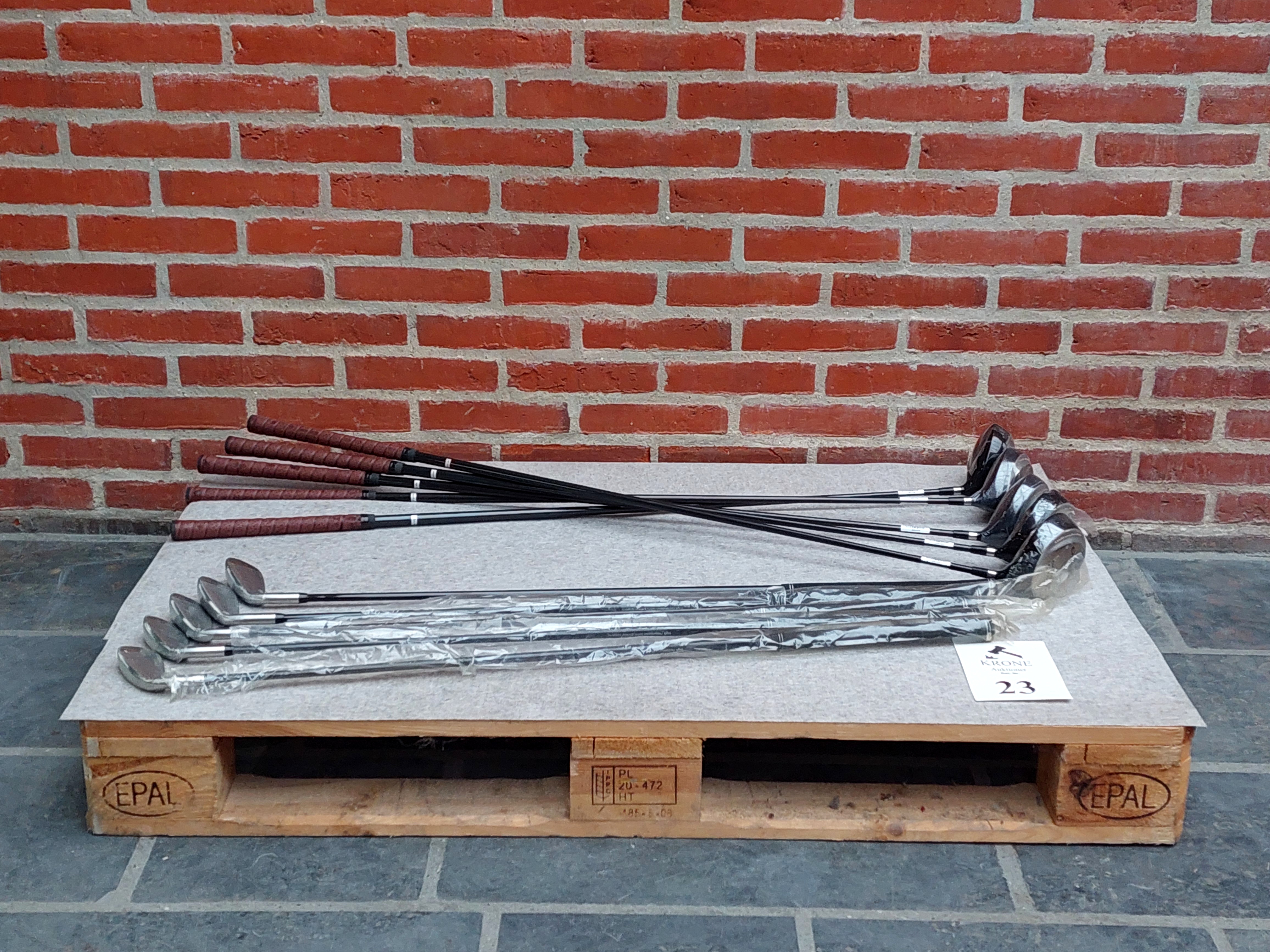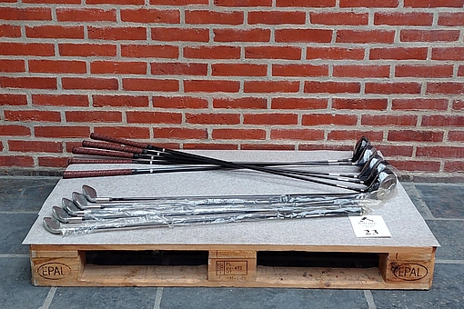 #23 10 stk Køller og jern. Heraf 5 køller og 5 jern (5, 7, 9, 9, 9) ubrugte.