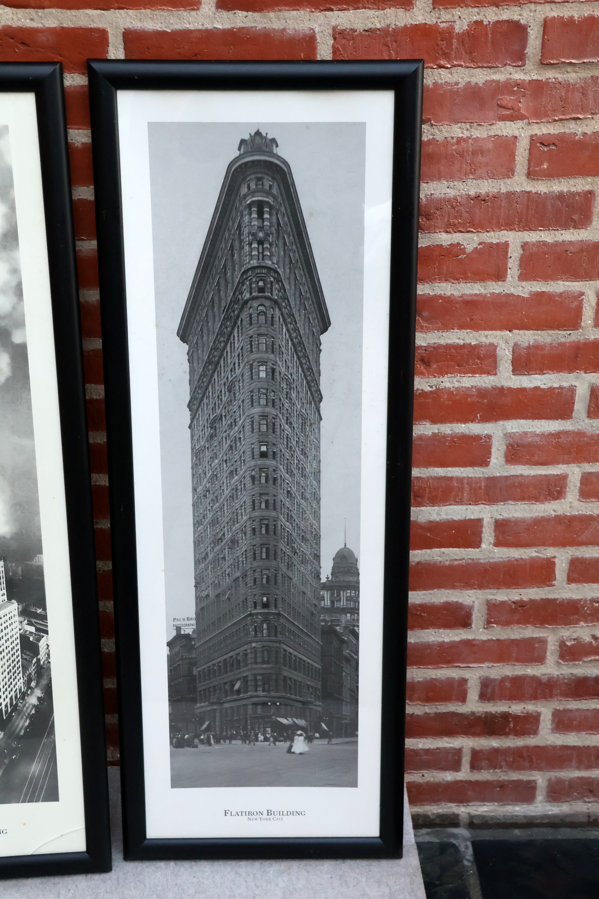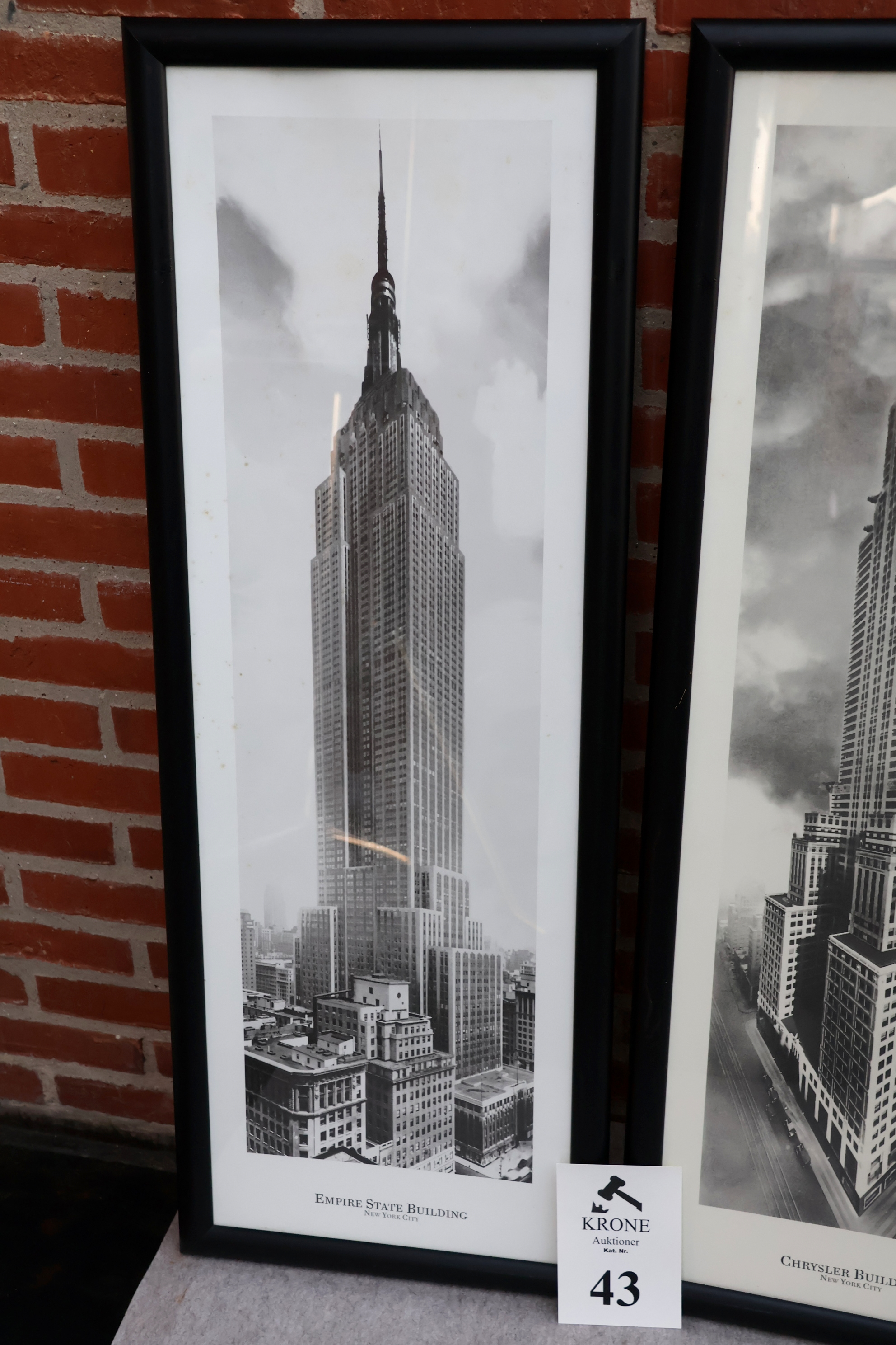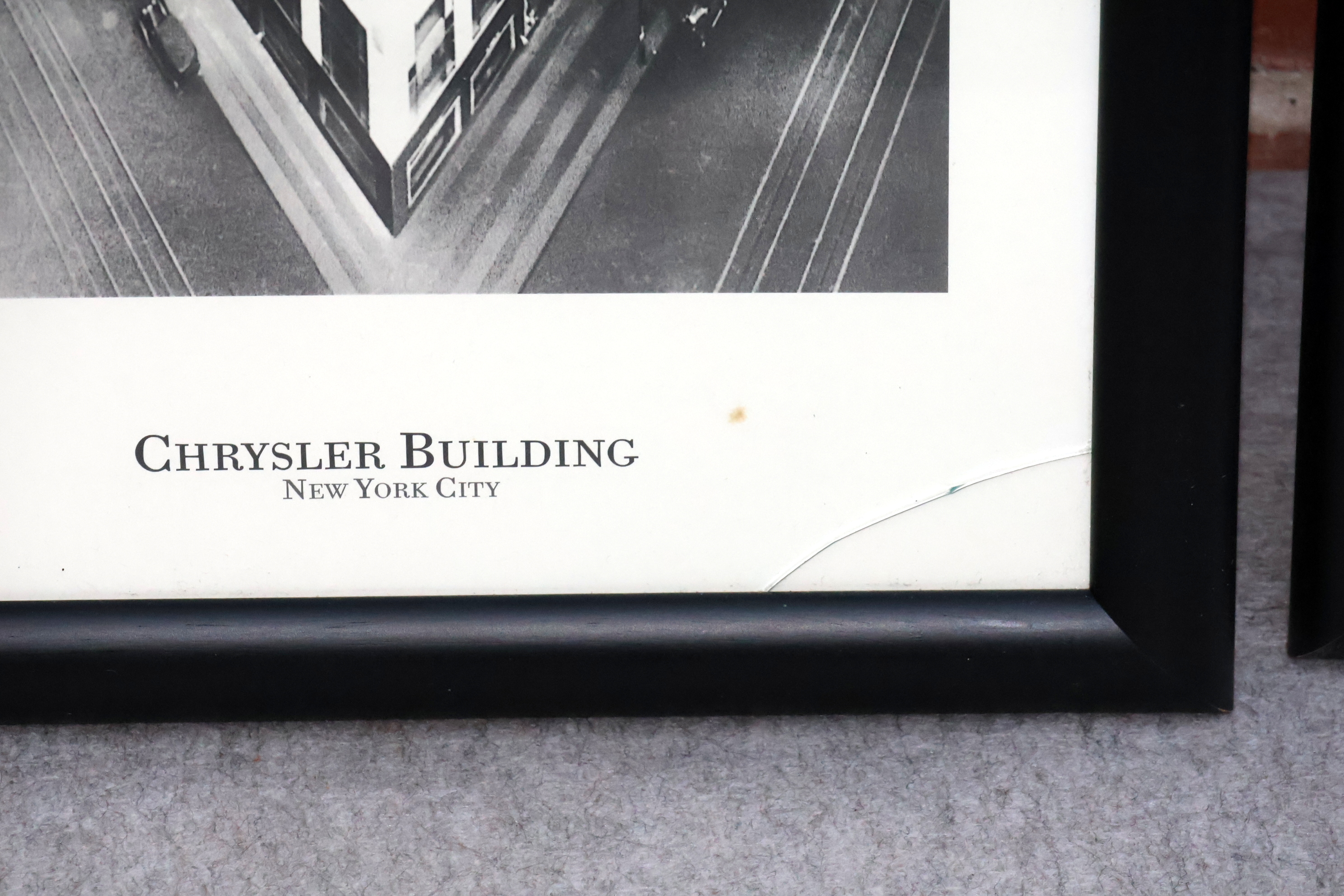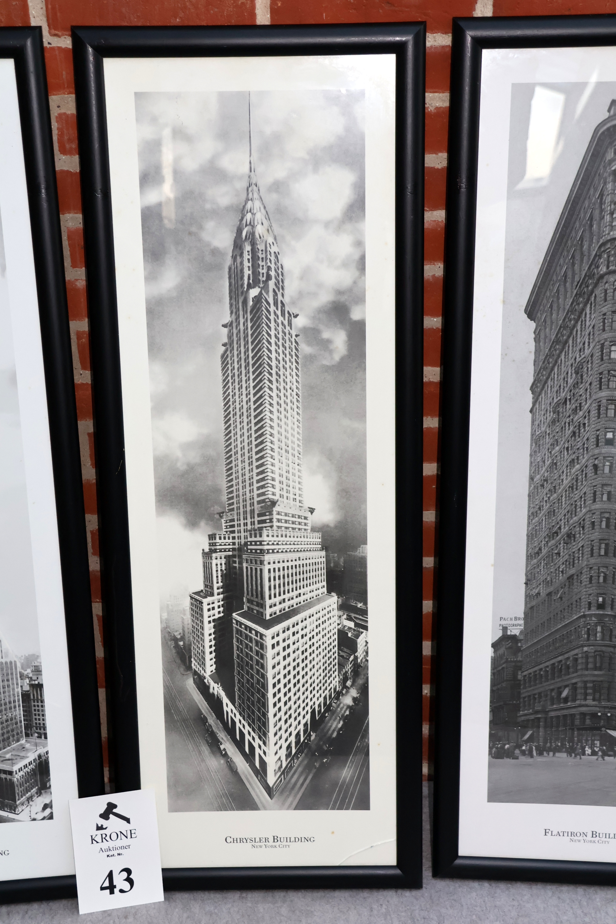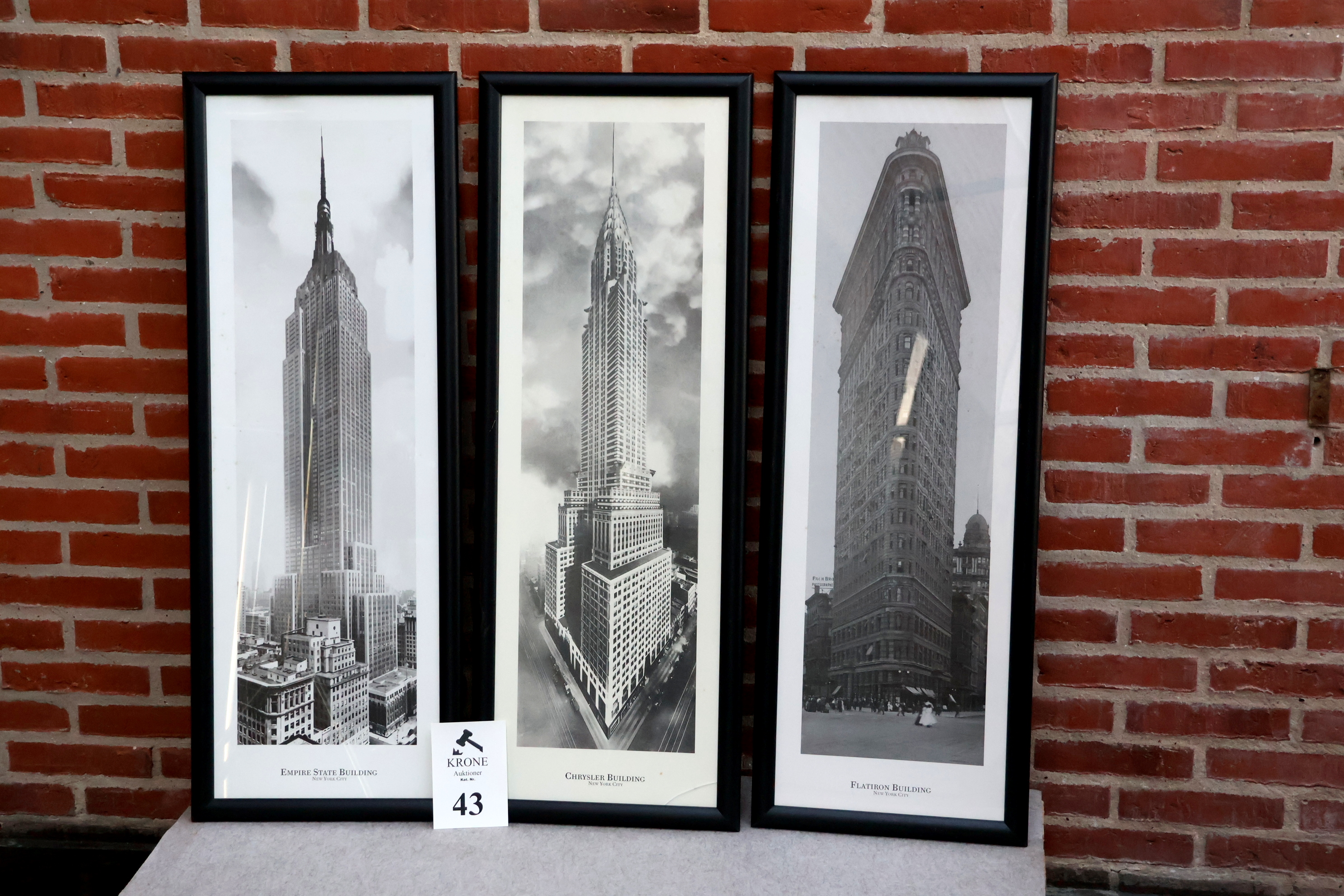 #43 3 Stk Indrammet plakater af New York bygninger, ca 105*38cm, 1 stk fremstår m/revnet glas. MOMSFRI.