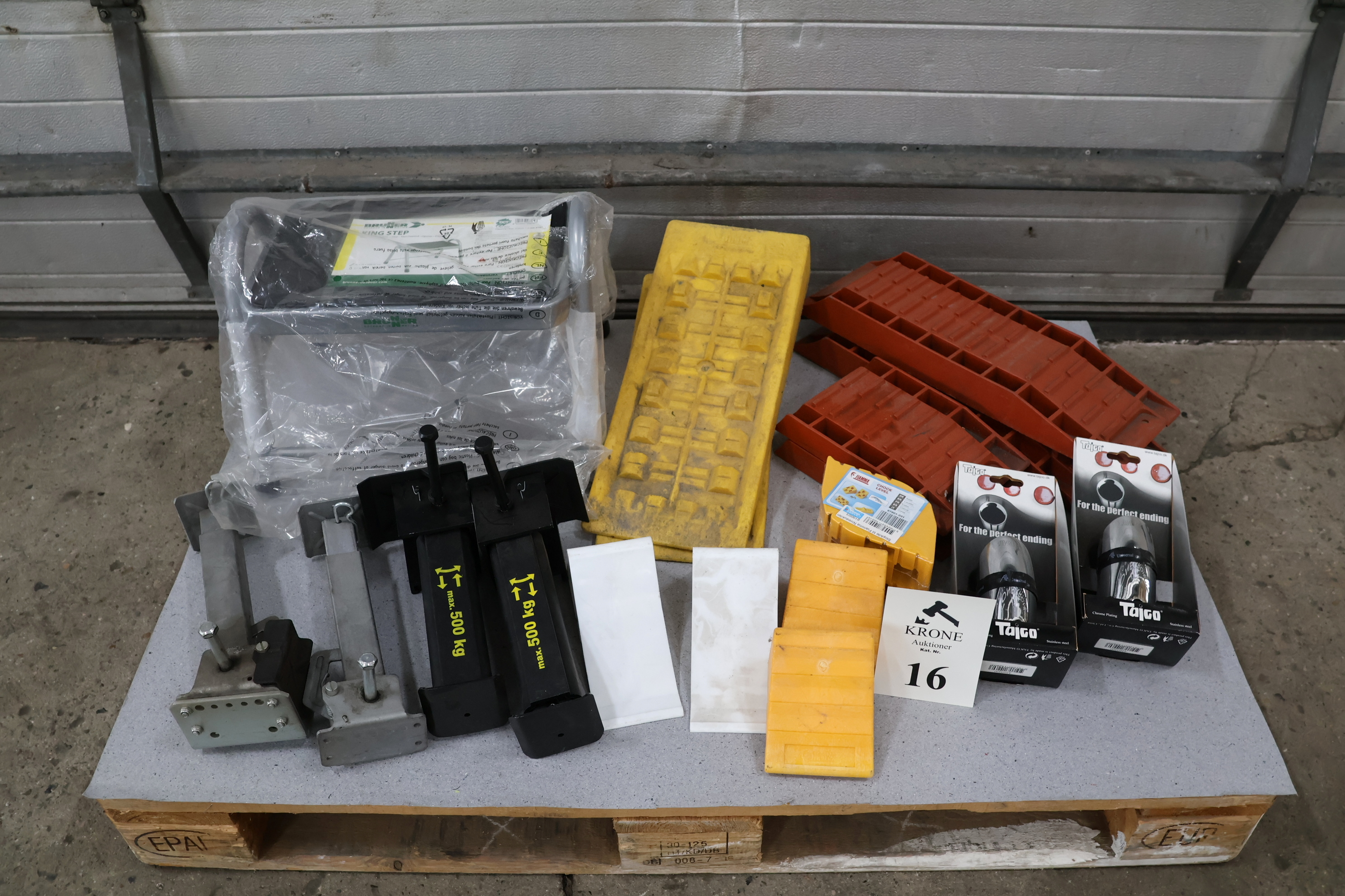 #16 Div Nivelleringskiler, rørhaler, trappetrin m.m. brugt/ubrugt.